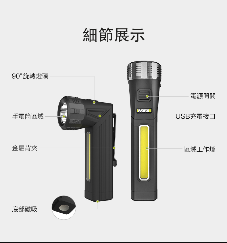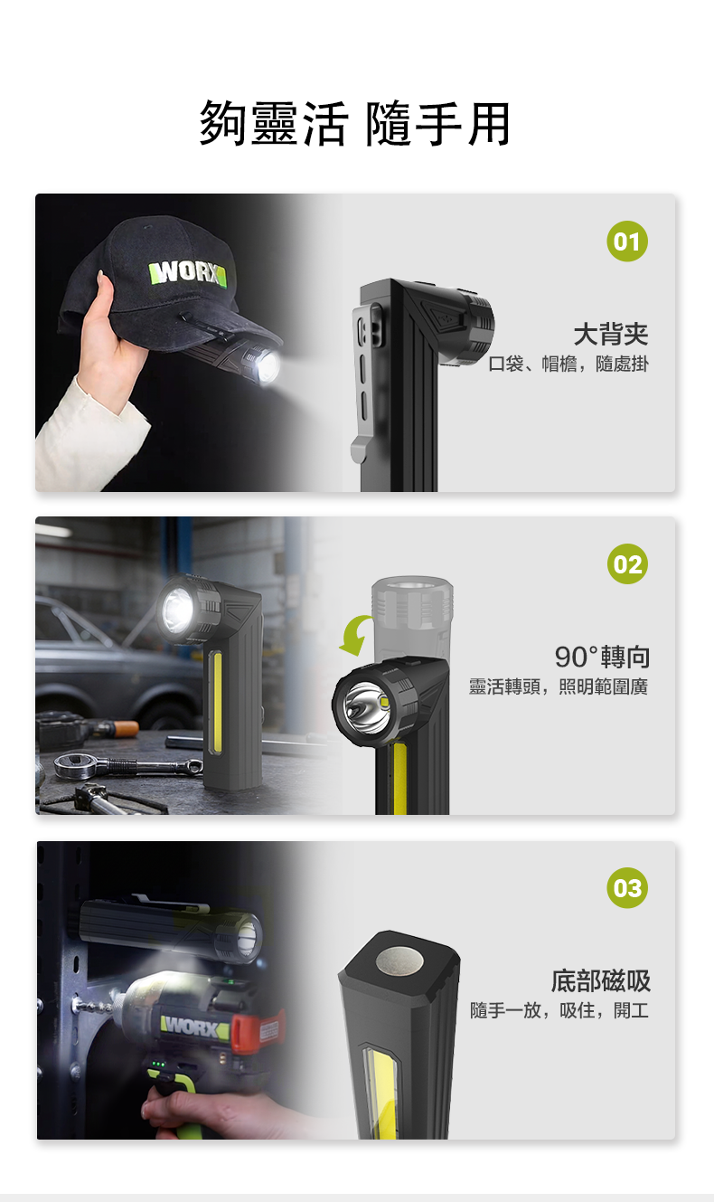 ✔️ 燈頭可 90° 轉向 → 想照邊就照邊
