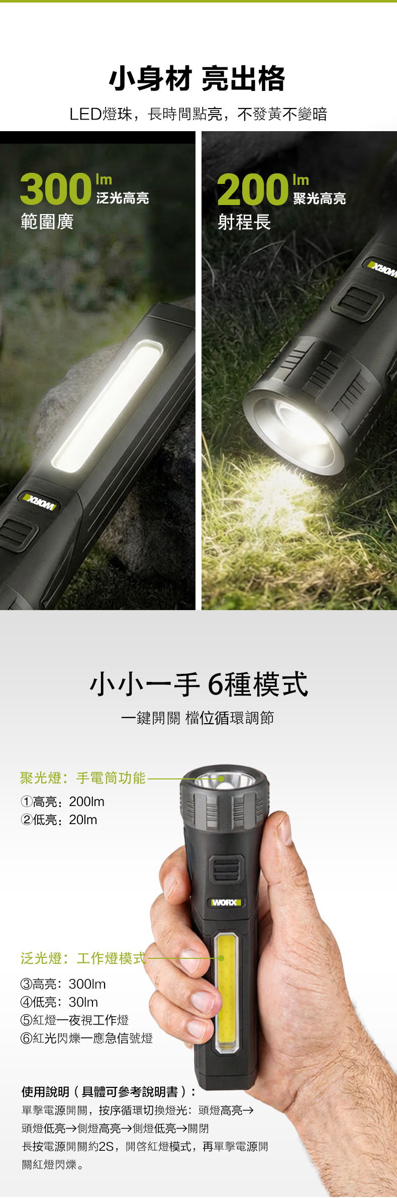 ✅ 泛光燈:大範圍照明(最高 300lm)